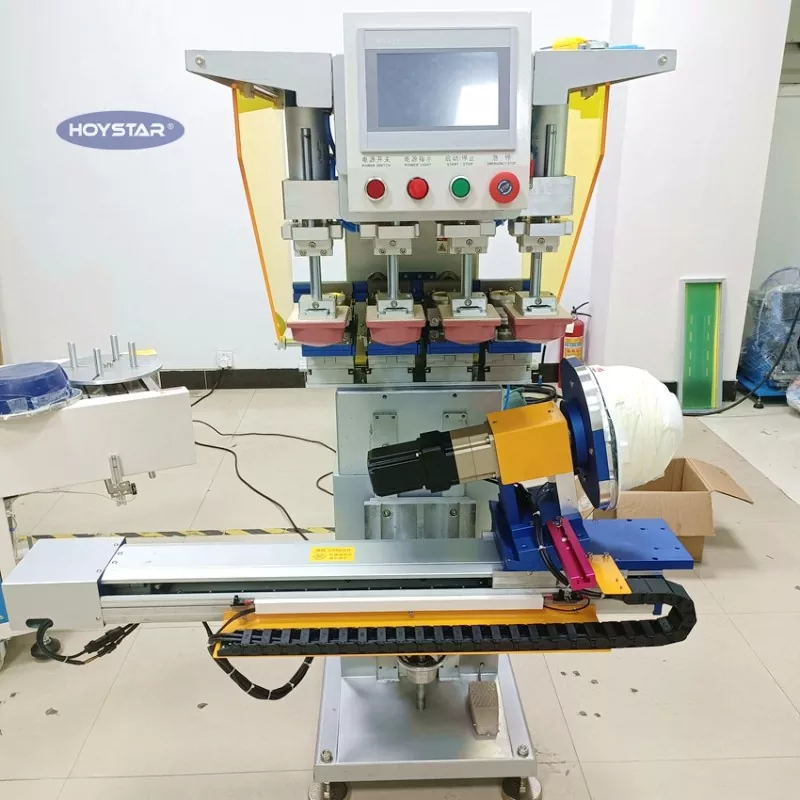 Nakupujte prispôsobený 4-farebný tampónový tlačiarenský stroj na prilbu od spoločnosti Dongguan Hoystar Machinery Co., Ltd., ktorá je jedným z výrobcov a dodávateľov v Číne. Tento 4-farebný tampónový tlačiarenský stroj HOYSTAR pre prilbu vybavený ovládacím panelom s dotykovou obrazovkou PLC s jednoduchou obsluhou. Tento stroj je vybavený ovládaním servomotora pre automatickú rotačnú tlač a ponúka možnosti tlače na 1 stranu, 2 strany alebo 4 strany prilieb. Pracovný stôl je poháňaný vľavo/vpravo, otočný uhol, výšky produktu je možné nastaviť. Každá tlačová hlava je nezávisle nastaviteľná a dá sa nastaviť samostatne.