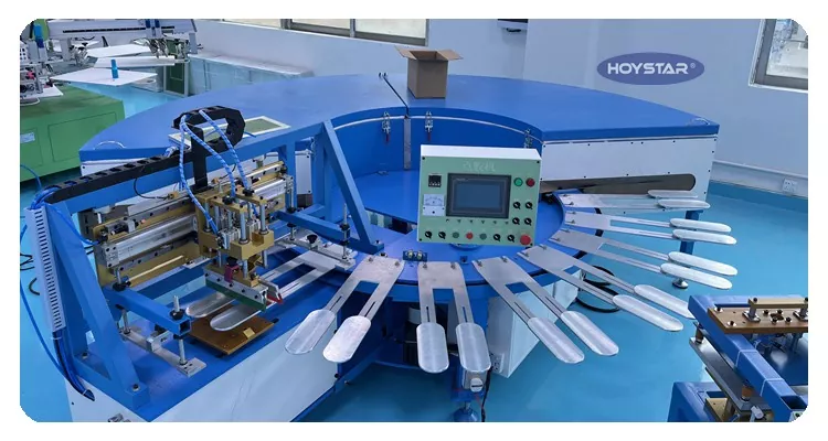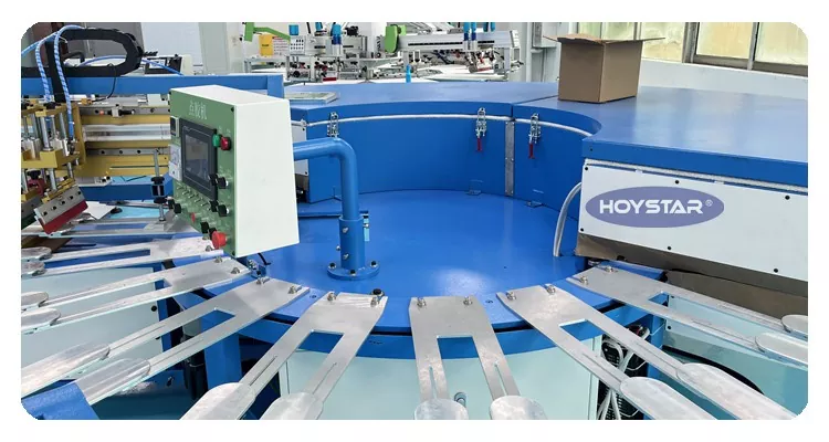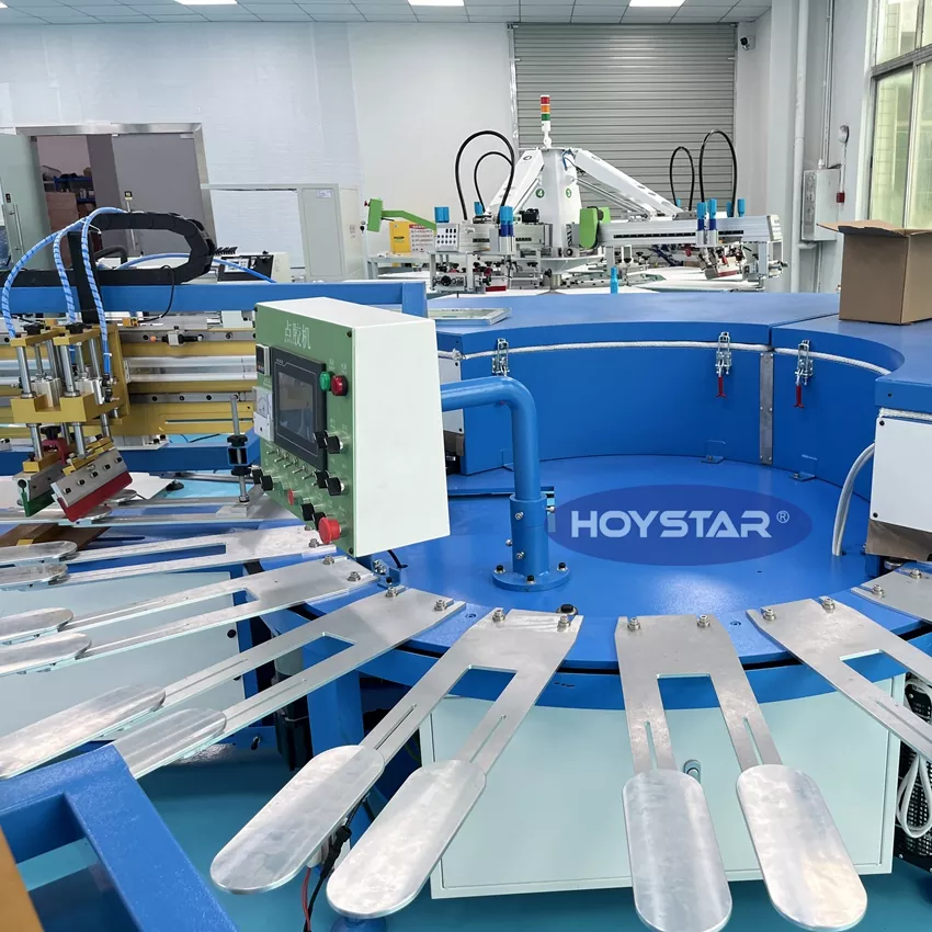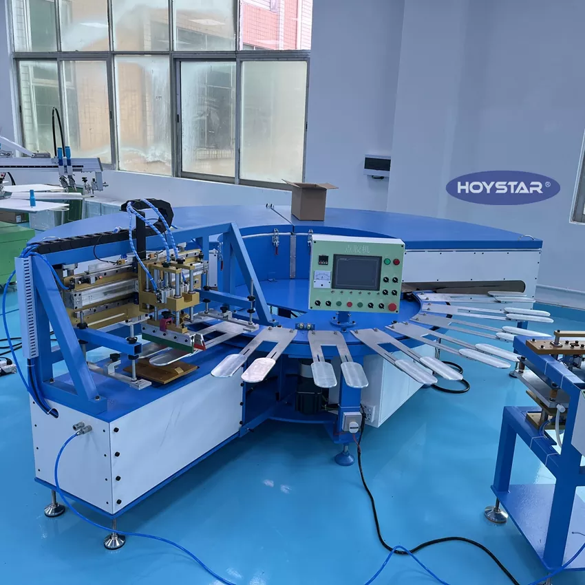 HOYSTAR je spoľahlivý výrobca a dodávateľ v Číne; Tento vysokorýchlostný sieťotlačový stroj na ponožky HOYSTAR je určený pre aplikácie v textilnom pletacom priemysle. S rýchlosťou až 800-1000 párov/hod je vhodný na potlač protišmykových ponožiek, detských ponožiek, ponožiek pre dospelých, futbalových ponožiek atď. Vybavený otočným pracovným stolom, veľmi pohodlné vkladanie a vykladanie ponožiek. Ovládanie dotykovej obrazovky PLC, veľmi jednoduché ovládanie. Stroj vybavený systémom sušenia dokáže dobre vysušiť kremík a atrament.