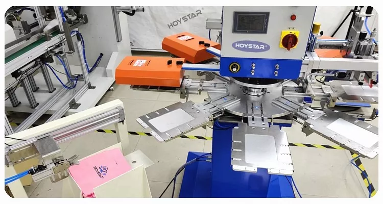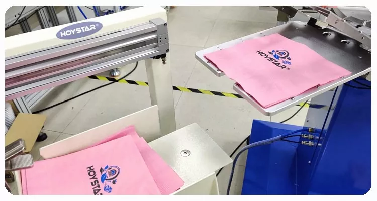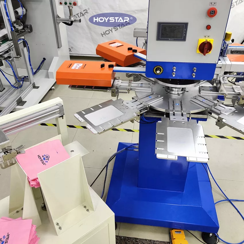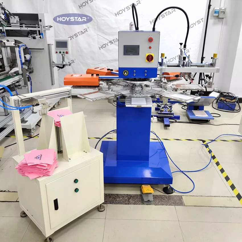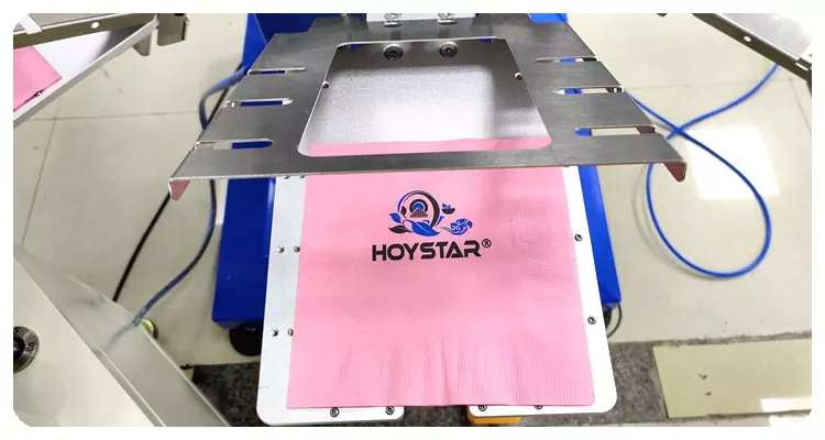 HOYSTAR je spoľahlivým výrobcom a dodávateľom v Číne; Tento automatický 2-farebný sieťotlačový stroj na obrúsky HOYSTAR je špeciálne navrhnutý pre plne automatickú tlač na obrúsky. Jeho zjednodušený proces tlače prebieha nasledovne: manuálne vloženie obrúskov do stroja – automatická tlač prvej farby – automatické sušenie – automatická tlač druhej farby – automatické sušenie – automatické vykladanie – a automatický zber produktov.