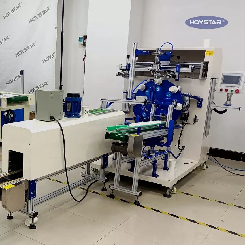 Ako profesionálny výrobca a dodávateľ je plne automatický jednofarebný sieťotlačový stroj HOYSTAR pre PP/PET poháre profesionálne navrhnutý na tlač na rôzne typy pohárov, aby vyhovoval špecifickým potrebám scenárov tlače pohárov. Plne automatický režim tlače – s automatickým vkladaním, automatickou tlačou, automatickým vykladaním a systémom IR sušenia šetrí pracovnú silu. Vybavený ovládaním dotykovej obrazovky PLC, bezpečnou a užívateľsky príjemnou prevádzkou. Operátori môžu jednoducho dokončiť nastavenie parametrov, monitorovanie procesu a nastavenie stroja. Vhodné pre tlač na poháre rôznych špecifikácií. Stroj so stabilnou tlačou a flexibilnou prevádzkou dokáže splniť požiadavky zákazníkov na hromadnú výrobu.