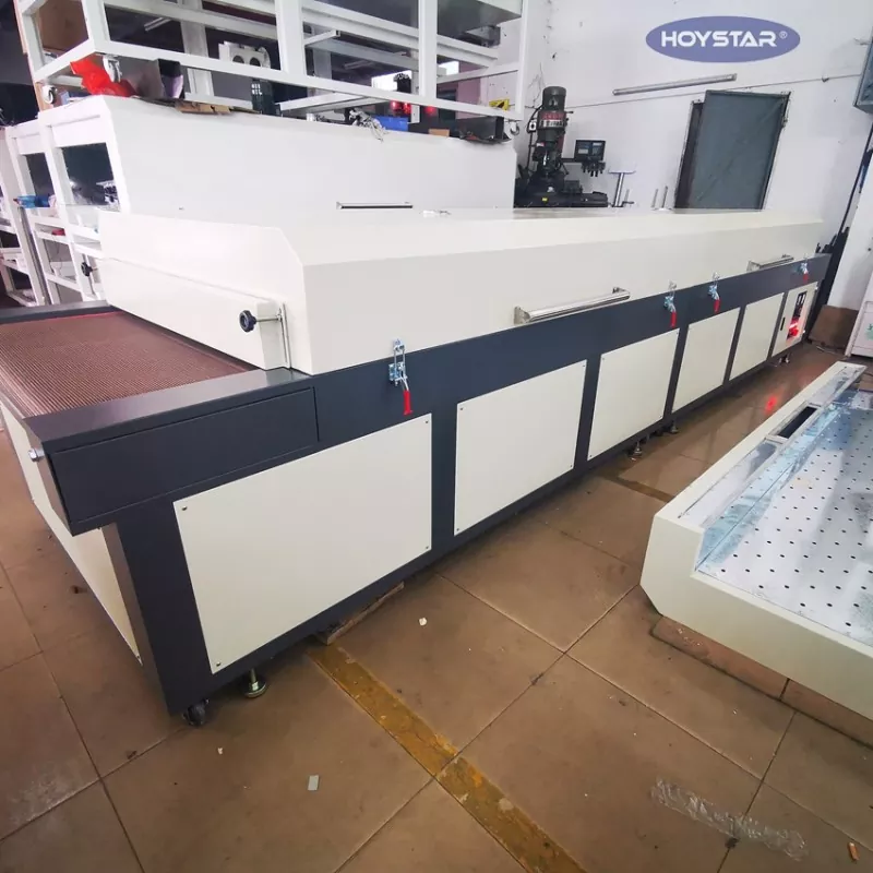 Ako profesionálny výrobca v Číne by sme vám chceli poskytnúť vysokoúčinnú veľkú infračervenú sušičku HOYSTAR s dopravným pásom. Vhodné na sušenie rôznych produktov – ako sú textílie, vlajky, bannery, hliníkové plechy, sklo, papier a plasty – po procesoch, ako je sieťotlač, maľovanie, nanášanie za horúca tuhnúceho lepidla, atramentová tlač a pod.