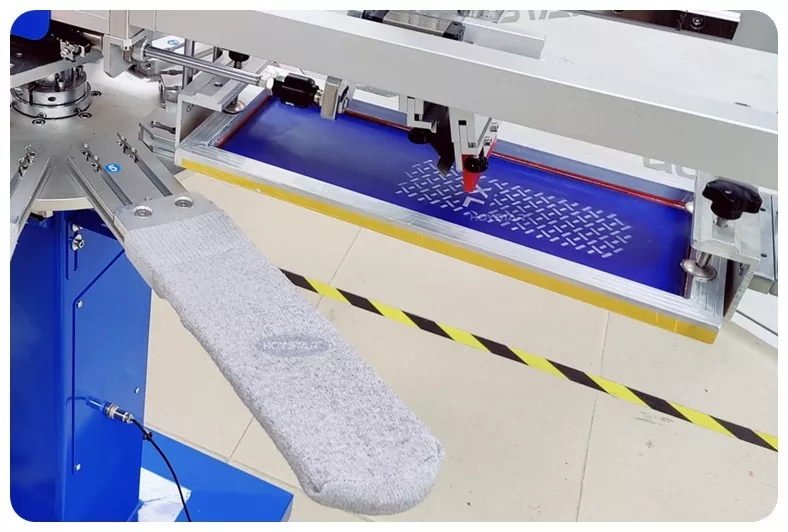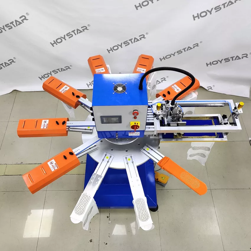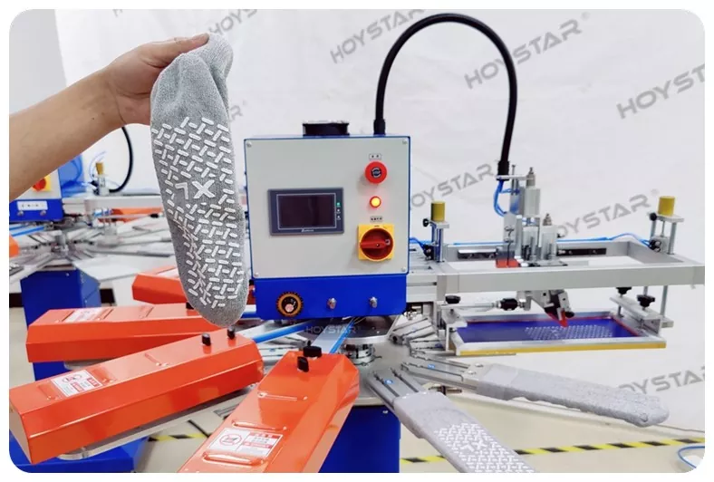 Ako profesionálny výrobca v Číne by sme vám chceli poskytnúť vysoko rýchly sieťotlačový stroj HOYSTAR na ponožky. Naše stroje využívajú ovládanie PLC a dotykovej obrazovky a používajú sa hlavne na tlač rôznych typov ponožiek. Stroj dokáže tlačiť na podrážky a päty ponožiek a je vybavený sušiarňou, ktorá dokáže dobre vysušiť silikón a atrament.