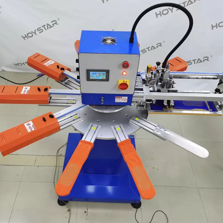 Ako profesionálny výrobca a dodávateľ je vysokorýchly sieťotlačový stroj HOYSTAR na ponožky navrhnutý pre aplikácie v textilnom pletacom priemysle. S rýchlosťou až 1000 ks/h je vhodný na potlač protišmykových ponožiek, detských ponožiek, ponožiek pre dospelých, futbalových ponožiek atď. Vybavený otočným pracovným stolom, je veľmi pohodlné vkladať a vykladať ponožky. Ovládanie dotykovej obrazovky PLC, veľmi jednoduché ovládanie. Stroj vybavený systémom sušenia dokáže dobre vysušiť kremík a atrament.